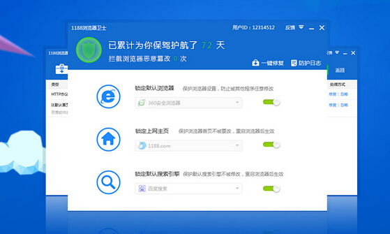 1188浏览器卫士守护主页,守护你的选择。1188浏览器卫士可以帮助你锁定默认浏览器、浏览器主页和默认搜索引擎,拦截流氓软件恶意篡改,简单实用告别困扰,一键修复所有用户设置,让所有流氓软件无处遁形!【软件功能特点】