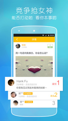 竞争抢女神,男生可通过回应的速度、内容、诚意金,竞争抢女神的关注,刺激好玩。