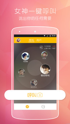 女神:任何时候都可发起呼叫,不管是无聊、心情不好,还是想约人出去吃饭,喜欢你的男生会立即回应。未经过你挑选,没有人能给你发信息,避免骚扰。