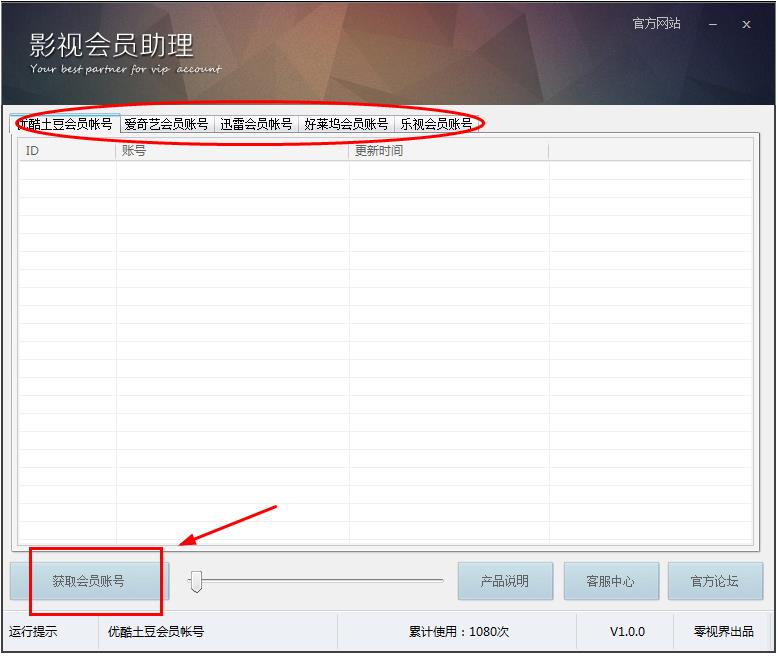 零视界会员帐号助手是一款由零视界官方推出的最新影视会员账号获取软件,这款软件安全稳定、绿色简洁、操作简单,帮助用户快速获取优酷、爱奇艺、迅雷、腾讯、乐视等视频站的会员账号,每天及时更新最新会员账号,喜欢的朋友快来下载使用吧!此软件完全免费。【零视界会员帐号助手软件说明】