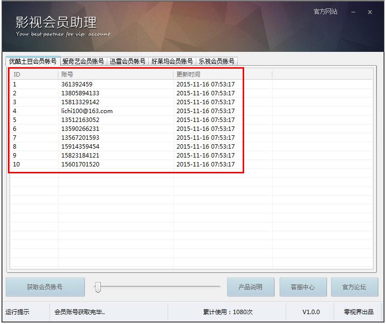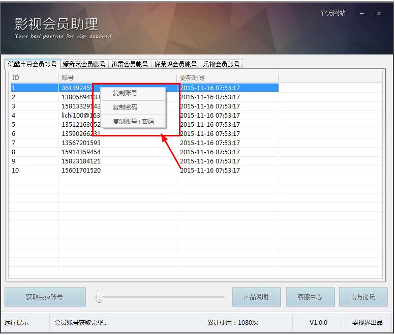 1、选择需要的会员,点击【获取会员账号】即可。2、会员账号获取完毕。