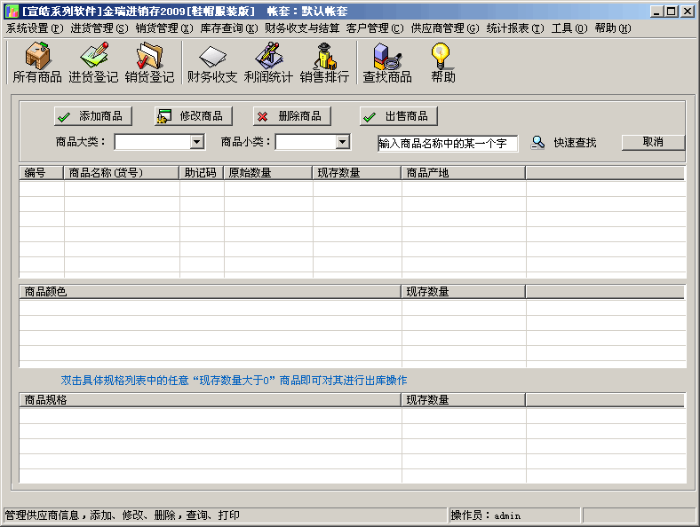 金瑞进销存2010,是一款专为中小型店铺设计的销售管理软件,其中包含商品进货登记、进货退库、商品销售登记、销货退回、库存管理、收支管理、应收应付管理、用户管理、帐套管理、财务结算、营业员提成(营业员提成有按销售数量和按销售金额提成)、销售排行榜和强大的报表系统,及强大的会员管理(生日提醒)等子模块。