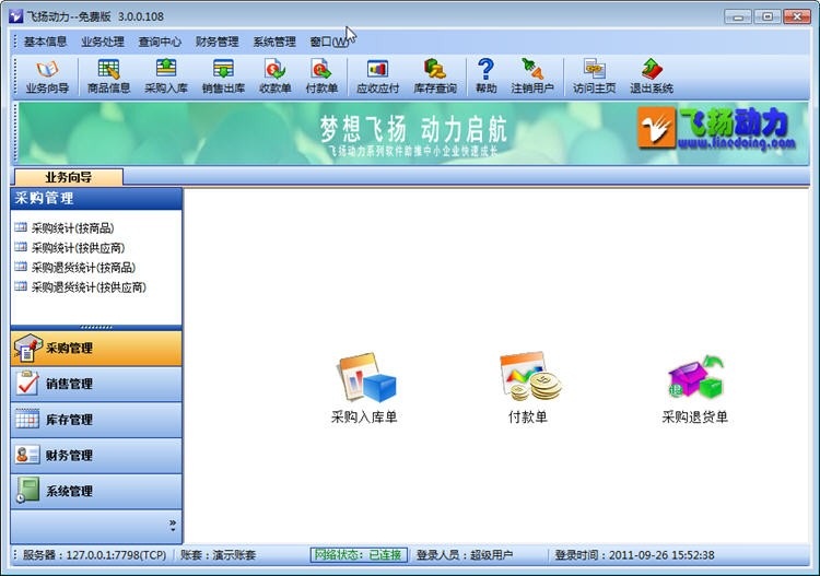 飞扬动力进销存免费版是一款面向中小型企业的经营管理软件,目前广泛应用于家电,日用品,建材,五金,电器,通信等多个经营销售领域。她操作简单,功能细腻而全面,用户只需录入简单的业务数据,系统就会自动生成采购,销售,库存,应收应付,利润,费用等各种重要数据,为不同行业不同岗位的人提供完善而准确的数据,彻底从繁琐的数据中解放出来,并能为经营者提供准确科学的决策依据。
