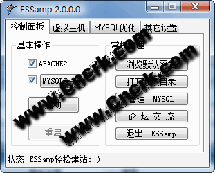 ESSamp是一款拥有图形界面的快速搭建网站服务器平台的绿色软件。您只需下载并解压ESSamp就能完成安装,如果您觉得不再需要ESSamp,只需直接将其目录删除,就完成卸载了。该程序包集成最新的Apache+MySQL+PHP+phpMyAdmin+ZendOptimizer+eAccelerator,无须安装,无须配置即可轻松选择并启动服务器、管理网站程序和数据库、开通虚拟主机并通过友好的自动和人工模式来设置相关属性和安全维护、优化数据库、端口管理及其它服务设置。ESSamp最大的特色在于它良好的可移动性,你可以把它无所顾忌的放在任何一个磁盘、目录里甚至是移动硬盘等,只要是可以安放它的地方,照样使用。有了它,轻松拥有属于自己的网站平台,将不再是奢望。
