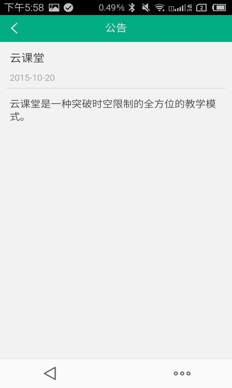 “云课堂”教师版是一类面向教育的互联网服务,是一种真正完全突破时空限制的全方位互动性学习模式。将已有的教育模式、内容、方法、体系进行重新的设计,老师的教学设计被融入到课程中,基于传统教学又超越传统上课的上课方式,带来了前所未有的体验。只需一个账号,你在电脑、iPad、手机上的活动记录就可实时同步更新。使用者只需要通过"云课堂"教师版平台进行简单易用的操作,便可快速高效地与学生分享教学课件,通过"签到"功能有效的得知学生的出勤率,通过"测验"功能及时掌握学生的学习情况,实现了真正的教学互动。【更新日志】