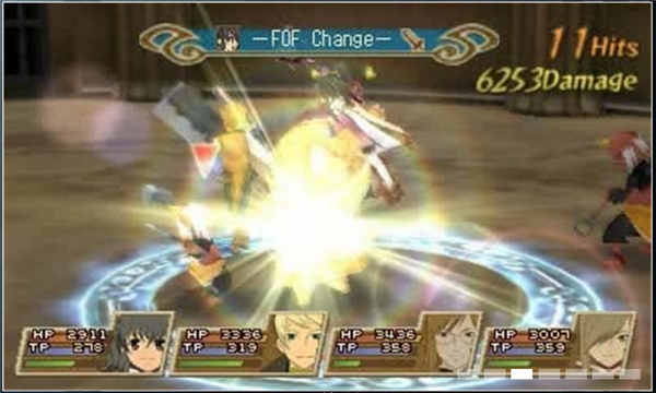 施展属性攻击后,在地图上就会开始累积音素 (也是元素的一 种)。当音素的累积达到一定的量,地图上就会出现一个名为FOF的圆阵。这个圆阵是带有属性的。这时在圆阵当中再使用特定的技能,就会变成威力强大的属性技能。只要善加利用它。就可看到非常出色的攻击效果。此外敌人也会利用这个FOF。