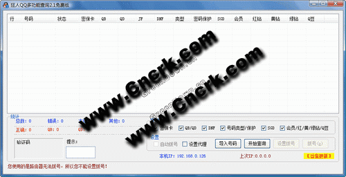 狂人QQ多功能查询 V2.1 简体中文绿色免费版 1、修正经常登陆地点软件自动识别,1码即可查QB.QD.JF(不是常用IP段还需要2码) 2、可查询密保卡、QB、QD、JF、DNF、DNF类型、密码保护、SGD、会员、红砖、黄砖、绿砖、Q豆----------13大功能免费开放 3、自动保存查询内容 4、导入文件后缀为.txt 5、导入文件格式:123456----123456