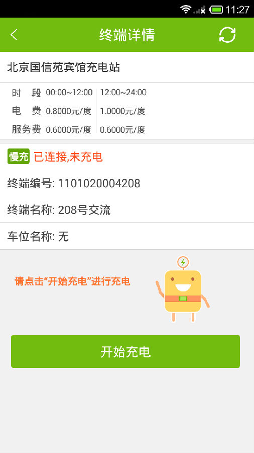 扫描成功进入终端详情页面,点击“立即充电”按钮,随即进入“充电中”界面。