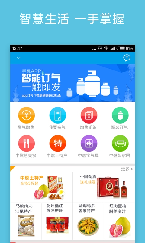中燃慧生活是中国燃气打造的一站式智能生活服务平台,让燃气缴费更省更方便,同时给您前所未有的购物体验。在线订气与缴费充值、燃气报数、报装报修都可以在这里轻松完成。这里还汇聚了全国各地的美食、特产,高性价比正品家具家电燃气具,正在以更丰富的内容连接千万人的生活和消费。中燃慧生活是中燃集团拥抱“互联网+”的一款APP软件,旨在为燃气用户提供足不出户即可在家充值缴费的便捷体验。该APP利用互联网平台系统,采用最先进的移动端开发技术,为广大燃气用户提供燃气费用缴纳、缴费明细查询、燃气保险购买等便民服务。目前全国近400个大、中、小城市都在普及这一软件