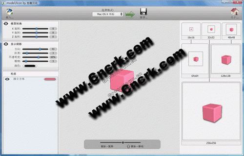 model2icon V1.00 汉化绿色特别版 model2icon转换3D模型到Windows和Mac OS X图标模式。你可以在互联网上找到很多模型并将它们转换为桌面上使用的图标,应用程序图标或其它图标。只需简单的几步,model2icon就可将3D模型转为Windows和Mac OS X图标。 它支持Windows Vista的256x256 alpha通道图标和新Leopard 256x256的Mac OS X图标。model2icon允许您在转换前自定义3D模型。支持3DS文件格式