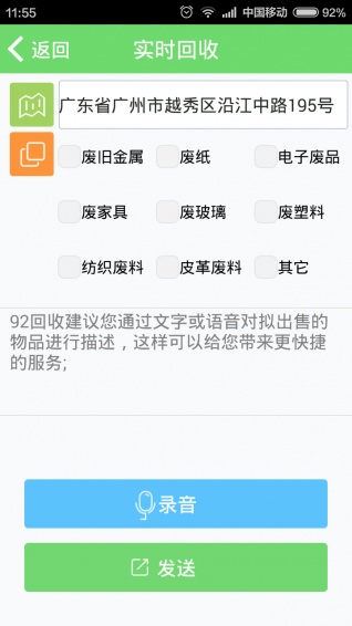92回收是一款手机垃圾回收服务软件,要想废物在利用造福于民,要想我们生活的环境更美丽空气更好,那就一定要做好垃圾的分类回收,所有92回收来帮助你轻松实现回来实现垃圾分类,让人人都能自觉做到这一切,改变就在一瞬间。【软件特点】