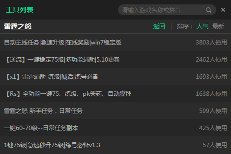 新浪雷霆之怒辅助是同名页游《雷霆之怒》的辅助工具,这款雷霆之怒免费辅助不仅能为玩家提供了自动主线、副本、日常等特色功能,还可以自动喊话、小号多开等,一键挂机坐等升级,让玩家彻底解放双手,直接体验游戏不一样的乐趣所在。