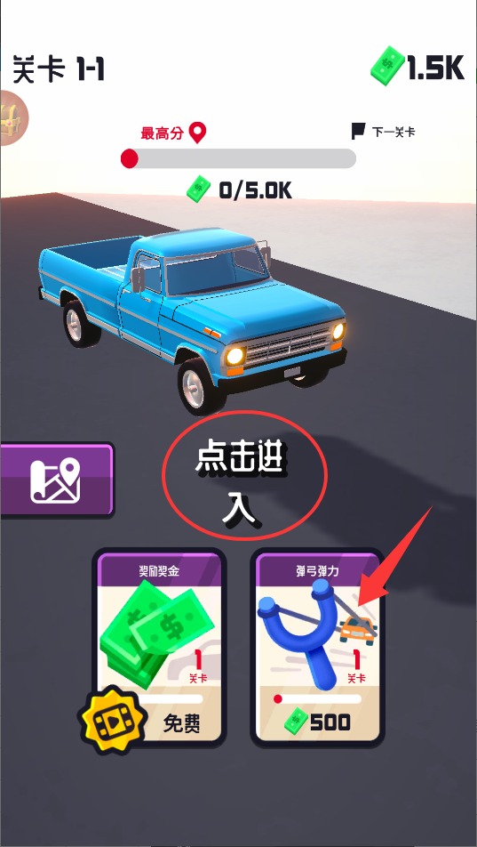 4、玩法升级强化。利用赚取的金币来增强弹弓威力,提升车身强度。经强化后的车辆可造成更巨大的破坏,进而获取更高分数。