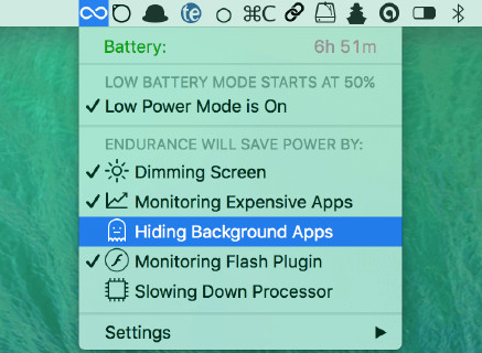 Endurance的工作机制和iOS9的低电量工作模式差不多,当Mac电量低于一定百分比时(90%–15%)会自动触发(LowPowerMode),模式开启后会对屏幕亮度进行调暗,监控消耗系统资源太多的软件程序(比如Chrome)、Flash插件,隐藏后台应用程序,并对处理器进行降速,据官方称,这款软件能在低电量模式下为设备延长约20%的额外电量使用时间。
