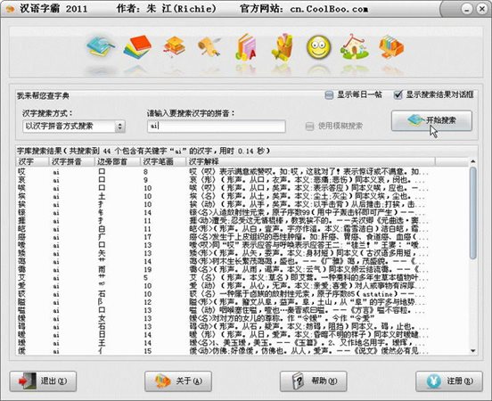 软件所提供的搜索方式,不管用哪一种方式搜索字库,完成整个搜索都不用半秒钟时间,这也就意味着使用“汉语字霸”软件,你可以在不到一秒钟的时间里翻完一本汉字容量为普通字典几倍的大字典。软件对每个汉字都提供了非常详细的解释、汉字拼音(有声调)、汉字拼音(无声调)、汉字笔画、汉字边旁部首、汉字五笔代码等,这些在软件中都可以查询到。