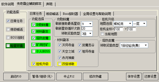 糖果传奇霸业辅助工具的主面板,可以选择日常任务、练级喊话和BOSS报时。糖果传奇霸业辅助工具的日常任务,可以挂机升级,功勋除魔、材料副本、塔防封魔、矿洞挖矿和个人BOSS。功勋除魔可以设置刷新接取最低星级和刷新星级循环次数,并设置领取奖励类型。材料副本可以勾选沃玛寺庙、封魔恶谷、天空之城、祖玛寺庙和赤月神殿。【练级喊话设置】