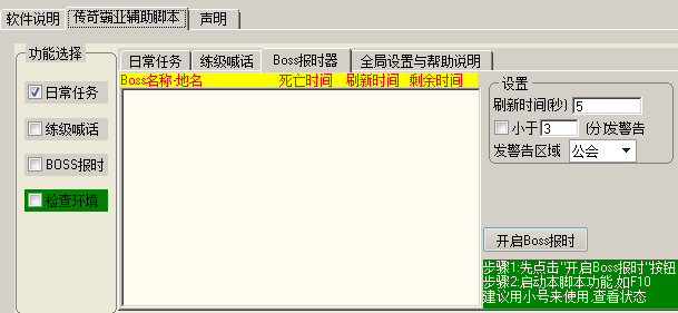 糖果传奇霸业辅助工具的BOSS报时器功能,有BOSS名称、地名、死亡时间、刷新时间和剩余时间。可以设置刷新时间、发警告的区域。步骤1:先点击“开启BOSS报时”按钮、步骤2:启动脚本功能,如F10,建议用小号来使用查看状态。