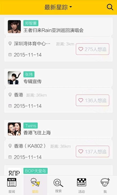 每天为粉丝提供过百条明星星踪,让粉丝随时随地了解偶像动态海量明星娱乐活动门票赠送,让粉丝近距离见到大明星