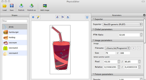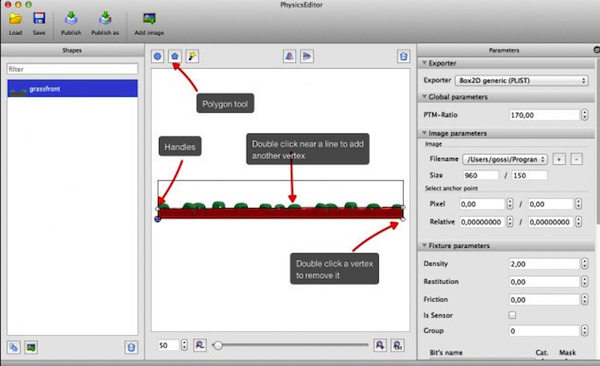 physicseditor Mac版最强的地方在于魔术棒工具,上面那个杯子的shape顶点,只需要点一下魔术棒就自动完成了标记顶点和分隔polygon的过程。依靠PhysicsEditor是一款可编辑Box2D和Chipmunk collision形状的物理编辑器。 只需画出一个个顶点就可以创建碰撞多边形,单击鼠标 或使用PhysicsEditor的魔术手就可直接跟踪图片形状的轮廓。