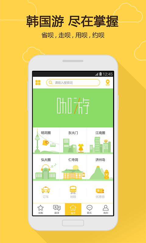 咖游韩国一款专门的中文韩国旅游应用。咖游致力于为游客提供吃喝玩购全方位的当地门店信息,从定制的优惠服务,精选的旅行锦囊和攻略,及时的互动翻译,出租车交通服务,到旅行中约伴聊天,让消费者享受最智能的消费生活。让您的游行,不受语言的障碍,不受地域的障碍,轻松自如。【软件特色】