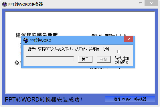 1. 启动软件,点击“运行ppt转Word转换器”2. 按照提示将要转换的ppt拖入打开的运行程序中。