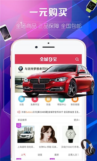1元能做什么?来全城夺宝吧,全新的移动互联网购物模式给你一个惊喜!【1元送惊喜】1元夺到宝!只需花1元就能获得价值过万的奖品,运气和RP很重要哦!