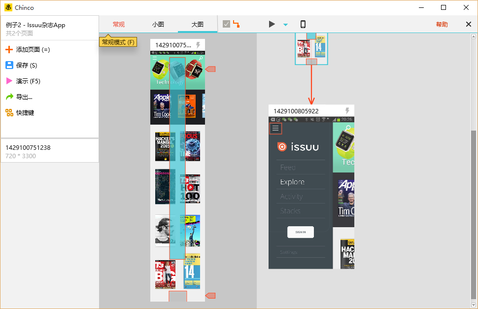 1.创建交互,拖一拖将设计图导入,在工作页上拖动鼠标创建交互区域,然后链接到其它页面,即可生成交互。