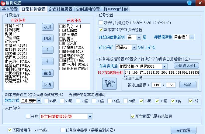 5.任务完成后挂机支持3种模式(1:BOSS之家一层循环打BOSS2:挂机+打世界BOSS3:BOSS之家打BOSS+世界BOSS).