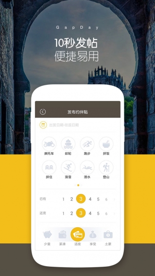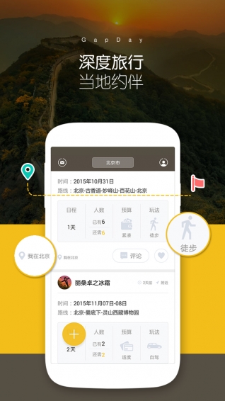 GapDay是一款基于地理位置的即时旅行结伴工具,帮助旅友在旅游过程中约伴、捡人。喜欢一个人出去,认识一大堆人回来。所以,就要约伴旅行。你是这样的吗?