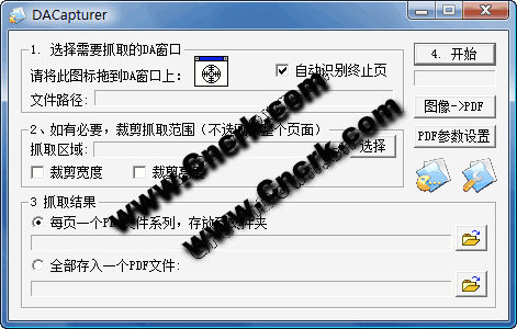 1、抓取用DesktopAuthor(以下简称DA)制作的电子书的页面,转换成PNG图像或PDF文件。 2、将图像文件(PNG、GIF、JPG、BMP、TIFF)批量合并、转换成PDF文件。