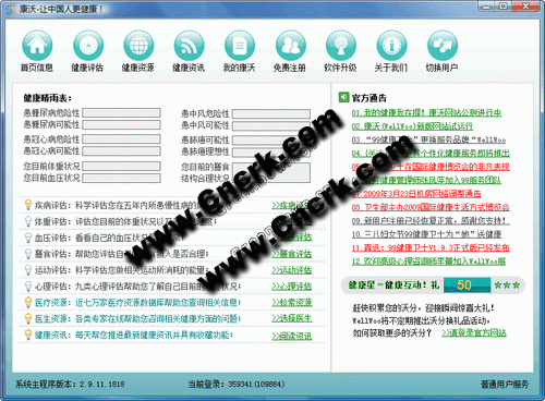 康沃健康管理软件 V2.9.11.1818 简体中文绿色免费版 中国首款免费自我健康管理软件-康沃(WellWoo),软著登记号:2009SR037643。为您提供丰富实用的自我健康管理工具和全方位互动的健康信息服务平台。。其特色功能包括:个人疾病风险评估、体重评估、血压评估、膳食摄入评估、运动评估、心理评估、即时健康资讯、在线私人医生服务,全国医疗资源数据库等