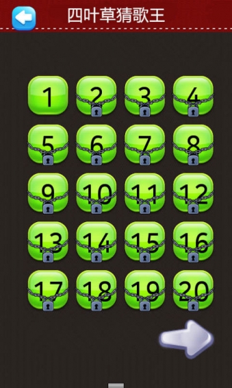 四叶草猜歌王 v1.2.3 安卓版 四叶草猜歌王是一款非常好玩的休闲类猜歌王游戏,这款游戏收集了大量的TFBOYS歌曲,玩家在游戏中只要触摸点击播放按钮开始听歌并在40秒内点选正确的答案即可。