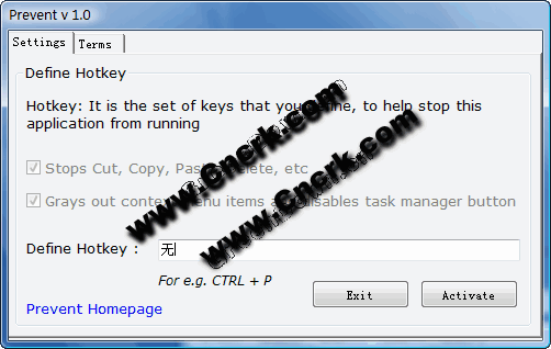 Prevent V1.0 英文绿色免费版 Prevent是Windows下的一款免费软件,用来禁用系统的复制、粘贴操作,包括禁用剪切(Stops Cut)、粘贴(Stops Paste)、复制(Stops Copy)、删除(Stops Delete)、复制到(Stops Copy To)、移动到(Stops Move to)、发送到(Stops Send To)、重命名(Prevents renaming)以及任务管理器的右键菜单等;同时运行Prevent后也屏蔽了Ctrl+C、Ctrl+X、Ctrl+V等快捷键