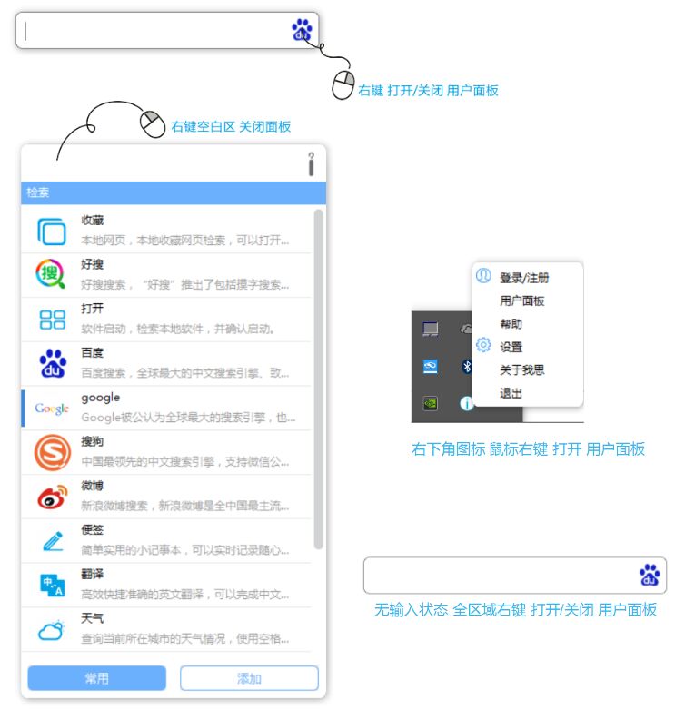 我思桌面搜索引擎是一款简洁小巧、界面美观的桌面搜索引擎,它集合了百度、360、谷歌、搜狗等多个搜索引擎,绿色安全无广告,用最简单的方式连接到一切服务需求和内容需求,致力于为广大用户提供最优质的服务功能。