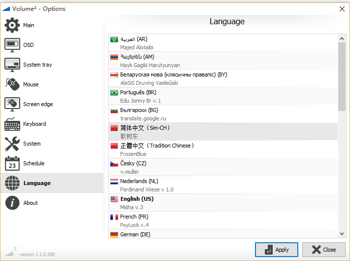 Volume有多种语言界面:俄语,乌克兰语,英语,中国,亚美尼亚语,德语,西班牙语,波兰语,意大利语,阿拉伯语,巴西,保加利亚,白俄罗斯,捷克,丹麦,法国,希腊,匈牙利,日语,韩语,拉脱维亚语,葡萄牙语,罗马尼亚语,塞尔维亚语,斯洛伐克语,斯洛文尼亚语,瑞典语,越南