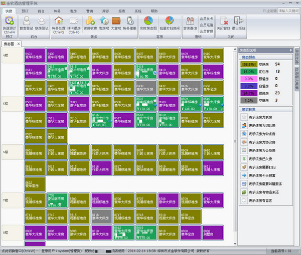 金软酒店管理系统是专为大中型酒店、商务型酒店、快捷酒店、连锁酒店设计开发的专业酒店管理系统。本系统功能强大、界面丰富美观,操作直观简单,可定制性极强。【软件特点】