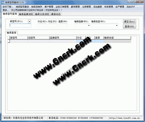 龙生轴承型号查询系统V2.01,经过近一年的数据收集、整理和开发,收集了近10万条轴承型号数据.该软件涵盖了包括:深沟球轴承,调心球轴承,角接触球轴承,圆柱滚子轴承,调心滚子轴承,圆锥滚子轴承,推力球轴承,推力滚子轴承 滚针轴承 、直线运动轴承,关节轴承,带座外球面球轴承等轴承规格信息,并包括AET、ASAHI、ASK、BARDEN、DKF、EASE、FAFNIR、FAG、FLT、GMN、IKO、INA、KOYO、AC、 MRC、NTN、NACHI、NSK、RIV、RHP、SKF、SNFA、SNR、STEYR、UBC、THK、ORRINGTON、ZKL等进口品牌轴承的型号对照信息及部分国产轴承的型号对照信息。轴承型号及新旧轴承型号对照等功能,便于从事轴承使用者、轴承销售人员及轴承设计和机械设计人员日常工作中的查询。