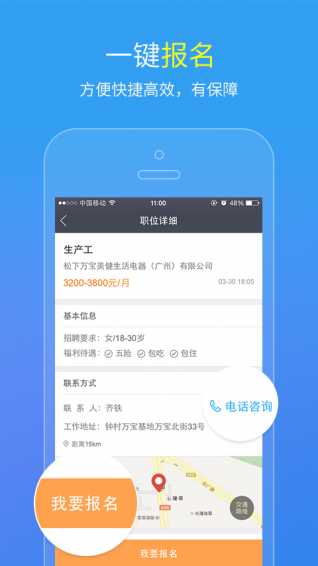 不用填写复杂的个人简历,简单的个人信息即可报名求职,入职成功高!
