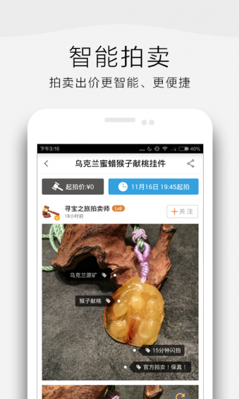 寻宝之旅app是一款应用于文玩收藏行业的移动应用,在寻宝之旅App中不仅能学到常见文玩鉴定知识、还可以近距离与大师交流沟通,定期举行文玩活动,参加文玩活动就有机会赢取大奖,在这里找到您想要的、想了解的任何知识应有尽有。