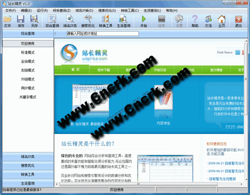 站长精灵 V3.2 简体中文绿色免费版 站长精灵是一款功能强大的网站(页)、关键词分析优化工具,它具有高度集成、智能灵活、使用简单、绿色设计的特点,内置六大综合批量查询模式,数十项极具特色的单项查询分析功能,囊括目前常用的查询项目,并且拥有多项独具特色的查询分析功能,采用多线程核心代码,它能在极短的时间内返回大量的查询数据,让使用者轻而易举地得出正确的判断,无论是网站建设推广、关键词优化、域名买卖等方面都可以给出综合权威的数据以供分析,极大地提高网站管理人员的工作效率。