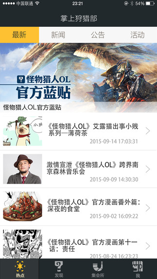 《怪物猎人OL》移动端应用,“掌上狩猎部APP”将承载起猎人交互平台的重担,独有的积分体系可以兑换游戏内的各种物品。使用“掌上狩猎部APP”不仅能获得第一手的狩猎资讯,还能够查询配装、武器派生、怪物攻略等各种游戏资料。还有各种丰富的小任务和小活动将定期展开。