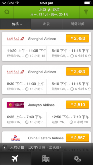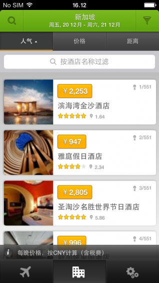 玩够旅行移动应用完全免费使用!您可以一站式搜索上百家机票和酒店预订网站,找到最低价!仅需进行几项简单的选择设置,玩够帮您从超过40万家酒店和上千家航空公司中挑选出您所需要的产品。产品特色:? 在一个应用内直接搜索机票和酒店? 一站式比较上百家网站的搜索结果和价格? 迅速找到酒店的特价促销优惠? 内置多重筛选器,可以轻松设定各种条件? 除简体中文、繁体中文和英语以外,玩够旅行还有其他多种语言版本? 功能强大,简单易用? 直接搜索您最喜欢的国内外机票酒店等旅游预订网站,包括 Booking 缤客,Agoda 雅高达,Expedia,亚航,酷航,虎航,捷星等上百家航空公司的官网,以及各家当地旅游服务在线预订商