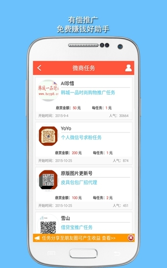 微肋手app是一款适合微商从业人员使用的营销软件,用户只要设定好自己要投放的广告,发布的微信朋友圈的后面就会添加上你设定的内容,也可以在各类有趣常识、搞笑段子或是与你产品相关的文章后面添加广告。利用丰富的朋友圈资源做宣传,可以很迅速很方便的达到营销的目的。