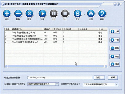 《闪电音频转换王》是一款功能强大的音频转换工具、影视视频音乐提取工具、音频压缩工具。可以在各种主流音频声音文件间相互转换,(如mp3、wav、wma、cd音轨、ac3、ogg、aac、mp2、flac、rm、ra、amr、aiff、mmf等音频间相互转换)。还可以从各种主流视频格式中提取其中的音频声音文件,(如从RM、RMVB、VOB、DAT、VCD、SVCD、DVD、ASF、WMV、MP4、3GP、MOV、QT、MPEG、DivX、XviD、AVI、3GPP2、DV等视频格式中提取其中的音频声音文件并保存为mp3、wav、wma、cd音轨、ac3、ogg、aac、mp2、flac、rm、ra、amr、aiff、mmf等音频格式)。支持amr_nb、amr_wb、mmf手机铃声格式转换。还支持任意分割,截取各种音频文件。支持同一种音频格式在不同压缩率、采样率、比特率之间的转化(可以压缩音频文件)。支持调节声音音量大小功能,可以增大或降低音频文件音量大小。软件采用了最先进的编码和解码技术,转换速度和转换质量极佳。并且软件界面美观(可以更换软件皮肤),操作极为简单,支持批量转换大量的音频文件,提供转换后自动关机功能。【软件特点】