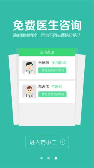 为用户提供在线问诊、在线购药、药店配货、药师快速送药上门等应用服务,省钱省事省时间是药小二给用户带来的价值。用户通过药小二,可以在线获得各大医院名医诊断,购药之后将从药店发货,由专业药师在一小时内送货上门