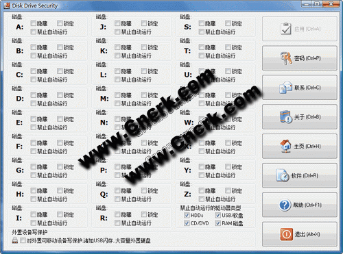 Disk Drive Security 是功能强大的磁盘安全工具,在主界面继承了所有的驱动器设置功能,并将所有可能存在的盘符列表显示。通过安全密码保护机制,能够隐藏或者锁本地磁盘、网络、软驱和USB驱动器,还可以在指定的驱动器类型中关闭自动播放功能。