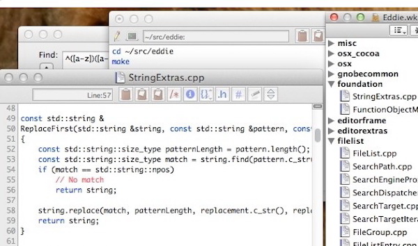 Eddieformac是一款适用于MacOSX系统上的代码编辑工具,Eddieformac是具备强劲引擎功能同时具备轻量级、简单、快速特点。非常适于C/C++/OBJ-C开发,HTML,Perl,Python和Lua等等。【软件特色】