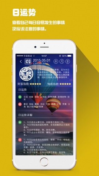 4.特色功能:星座运势、资讯卡片、周公解梦、观音灵签、财喜罗盘、安全期管理、人体节律。