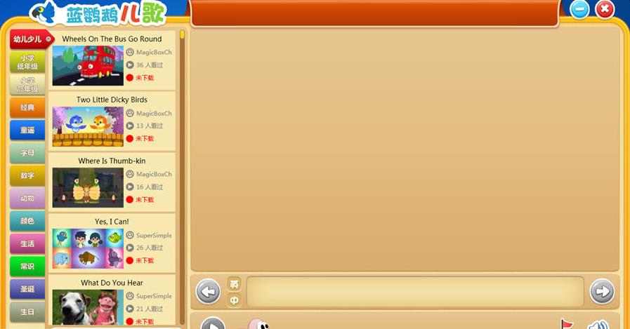 蓝鹦鹉儿歌是能飞英语推出的专门面向小学英语教学的《蓝鹦鹉》系列产品中,满足少儿学习英文童谣需求的软件产品。产品内包含了四百多首经典的英文儿歌,每一首歌我们都精心收集并匹配了“中/英”双语字幕,并且可随心操控双语字幕的显示和隐藏,上一句和下一句的方便切换。让孩子们在快乐地学习英文儿歌的氛围中,轻轻松松就掌握了英语的听、说、读的能力!!【软件特点】