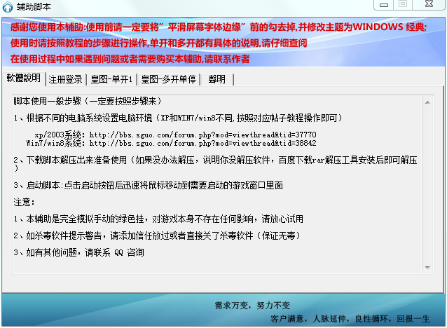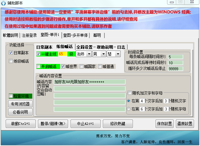 使用皇图辅助脚本修改功能后记得点击保存设置后再启动,本脚本提供了副本、挂机、喊话、练级等功能,是专为皇图打造的一款免费的辅助软件。